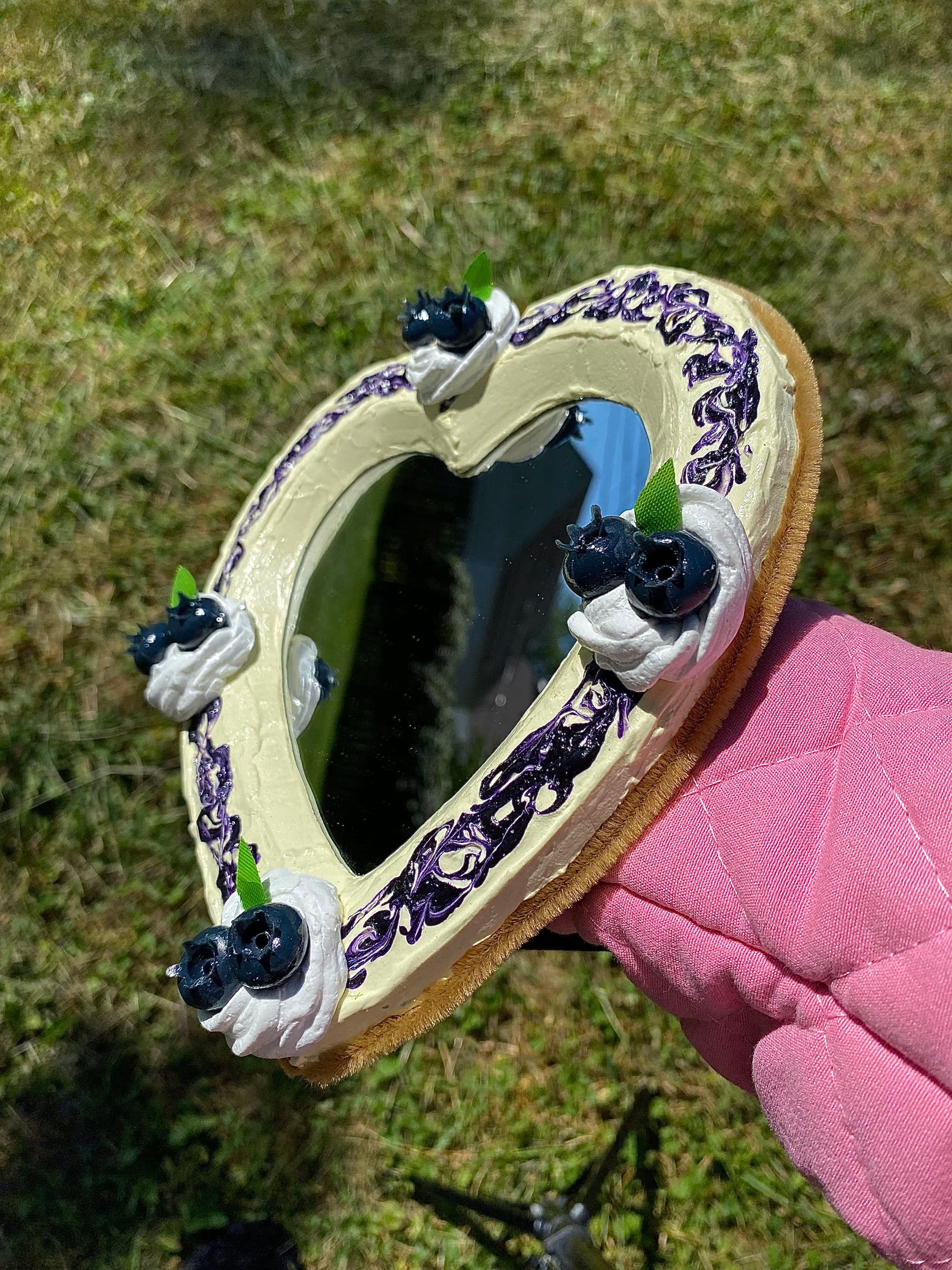 Our "Blueberry Swirl" faux cheesecake heart mirror is handmade w/ delicious blueberry swirled into our sweet & creamy, no-bake cheesecake filling.
